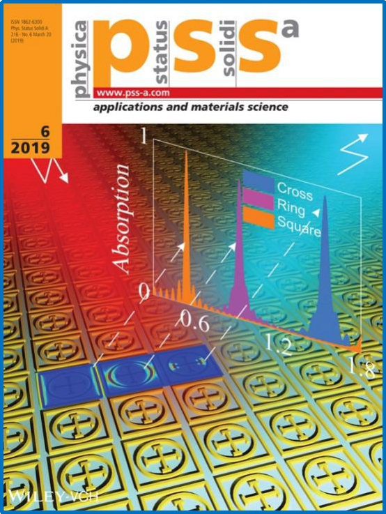 在对采用亚波长金属单元构成的太赫兹超材料吸收器的研究过程中,王玥教授与硕士研究生崔子健、朱冬颖、岳莉莎撰写的题为“Composite Metamaterials for THz Perfect Absorption”的论文发表在国际期刊《Physica Status Solidi A:Applications and Materials Science》(美国Wiley出版平台物理科学重要期刊,2017-2018影响因子1.795),这是公司作为第一作者单位发表的第一篇封面论文。