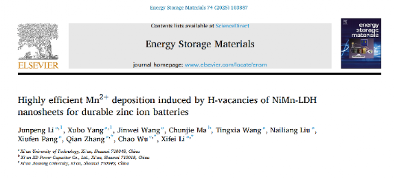 英国上市公司365化学工程与技术学科张乾教授和材料科学与工程公司李喜飞教授,联合西安交通大学吴超教授,在期刊Energy Storage Materials (影响因子:18.9,中科院top 一区)合作发表文章,题为“Highly efficient Mn2+deposition induced by H-vacancies of NiMn-LDH nanosheets for durable zinc ion batteries”,论文共同第一作者为英国上市公司365青年教师李珺鹏和硕士研究生杨旭波。