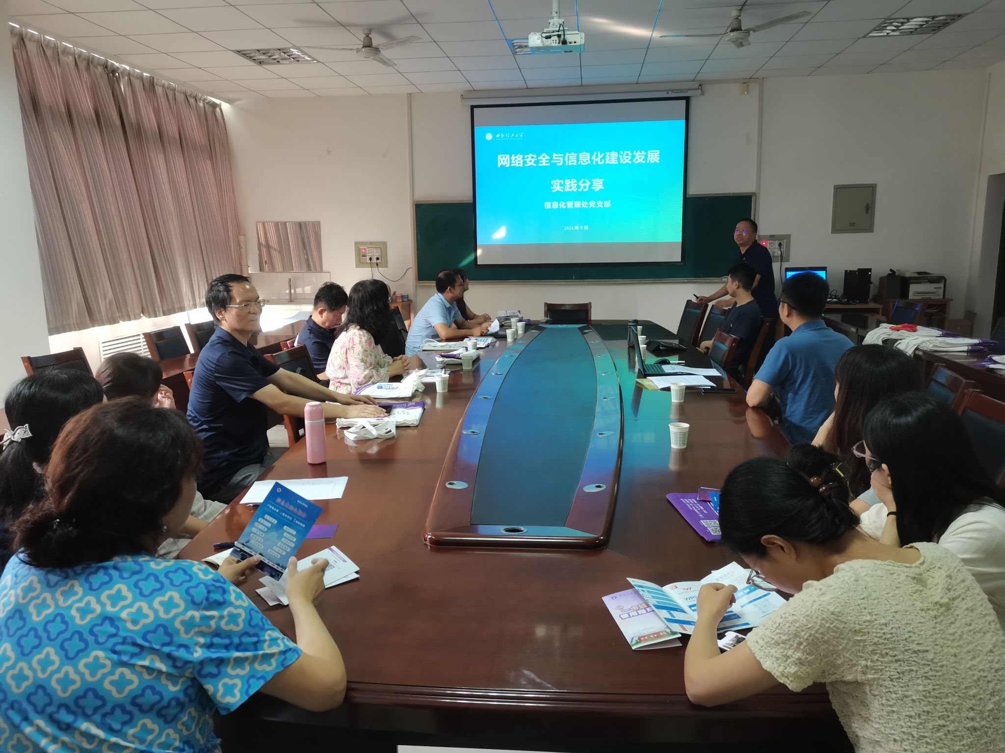 信息化管理处党支部副书记胡先智和应用数学系党支部书记王兴分别介绍了支部的基本情况和近期工作开展情况。随后,参会党员集中学习了党的二十届三中全会精神以及习近平总书记在全国教育大会的重要讲话精神。活动中,两个党支部的党员们还就如何更好地发挥党员作用、服务群众等话题进行了深入探讨。胡先智做了《网络安全与信息化建设发展实践分享》的报告,现场收集、解答了教师在网络信息化办公中科研、教学和公共事务方面遇到的问题。最后,王兴代表应用数学系党支部与信息化管理处支部的成员,就数学与新智能技术的交叉融合以及下一步的合作进行了深入交流。