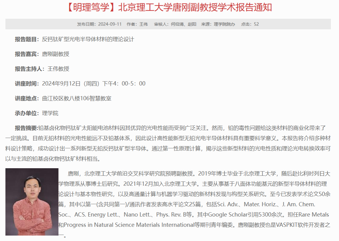 教师节前后,公司邀请西安交通大学张磊教授、陕西师范大学唐三一教授、浙江大学许楠副研究员和北京理工大学唐刚副教授来公司分别作《医疗大数据、医学人工智能和卫生经济学评价》、《药理毒理效应的普适性模型与数据分析》、《基于机器学习模型的光谱模拟和固态电解质离子传输机制研究》和《反钙钛矿型光电半导体材料的理论设计》的学术报告,不断开展学术交流,持续营造教职工学术氛围感。