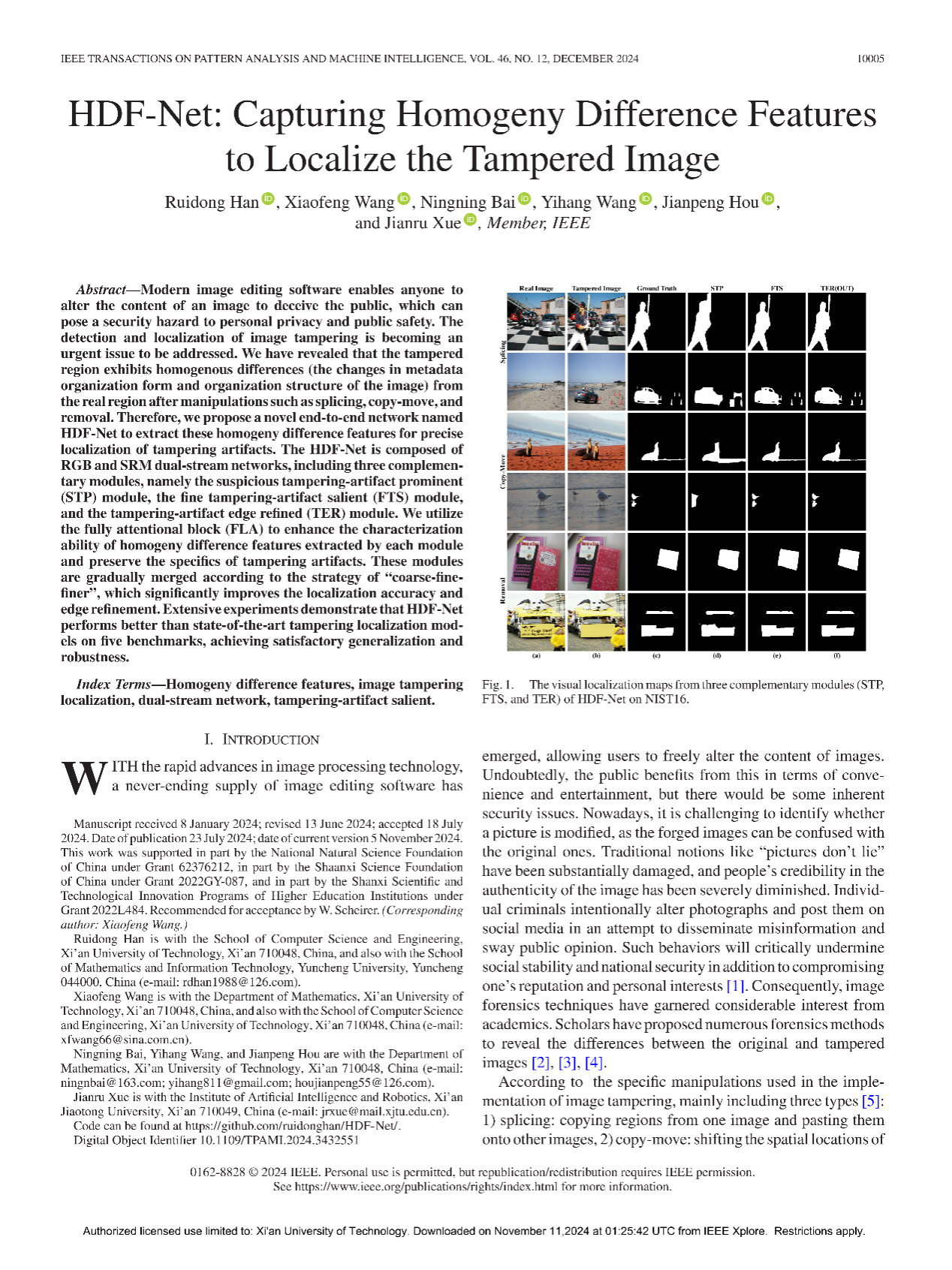 近日,英国上市公司365‍‍‍‍‍‍‍‍数学系王晓峰教授团队,在人工智能、模式识别与机器学习领域顶级学术期刊IEEE Transactions on Pattern Analysis and Machine Intelligence(简称为TPAMI,中国科公司一区TOP、CCF-A类国际期刊,2024年最新影响因子为20.8)上正式发表学术论文《HDF-Net: Capturing Homogeny Difference Features to Localize the Tampered Image》,这是公司首次以第一单位在该期刊上发表的研究成果。