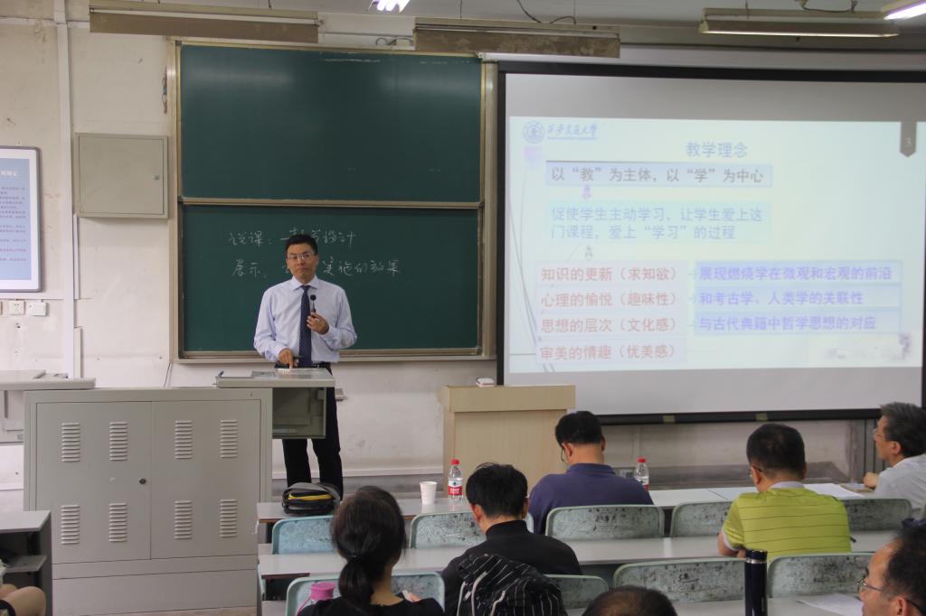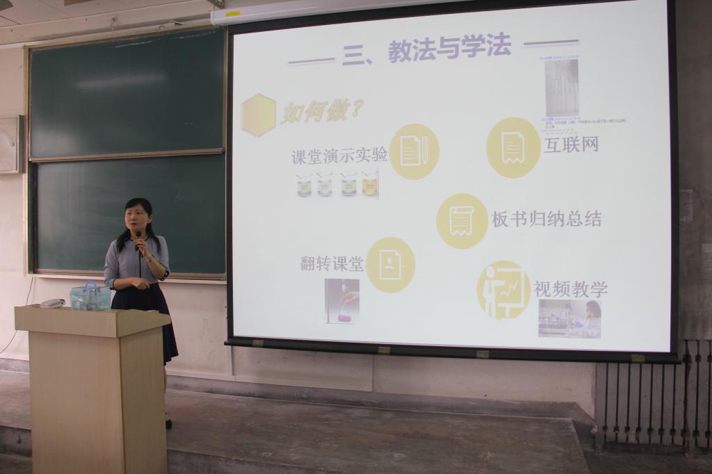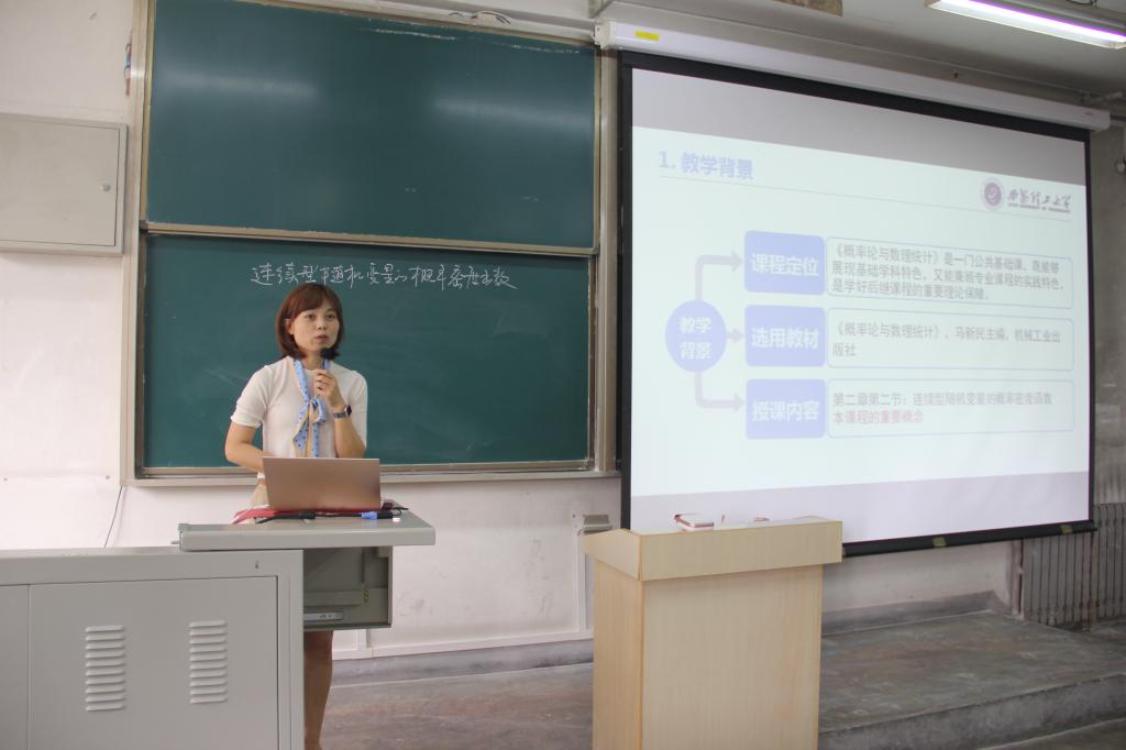 杨蓉教授从课程内容、教学重点与难点、教学与学法、教学过程四个方面以“酸碱缓冲溶液”为题给老师们分享了自己对说课环节的理解。陈娟娟老师从教学背景、教学目标、学情分析、教学方法、教学过程五个方面以“连续型随机变量的概率密度函数”为题展示了整个教学设计与教学实施过程。