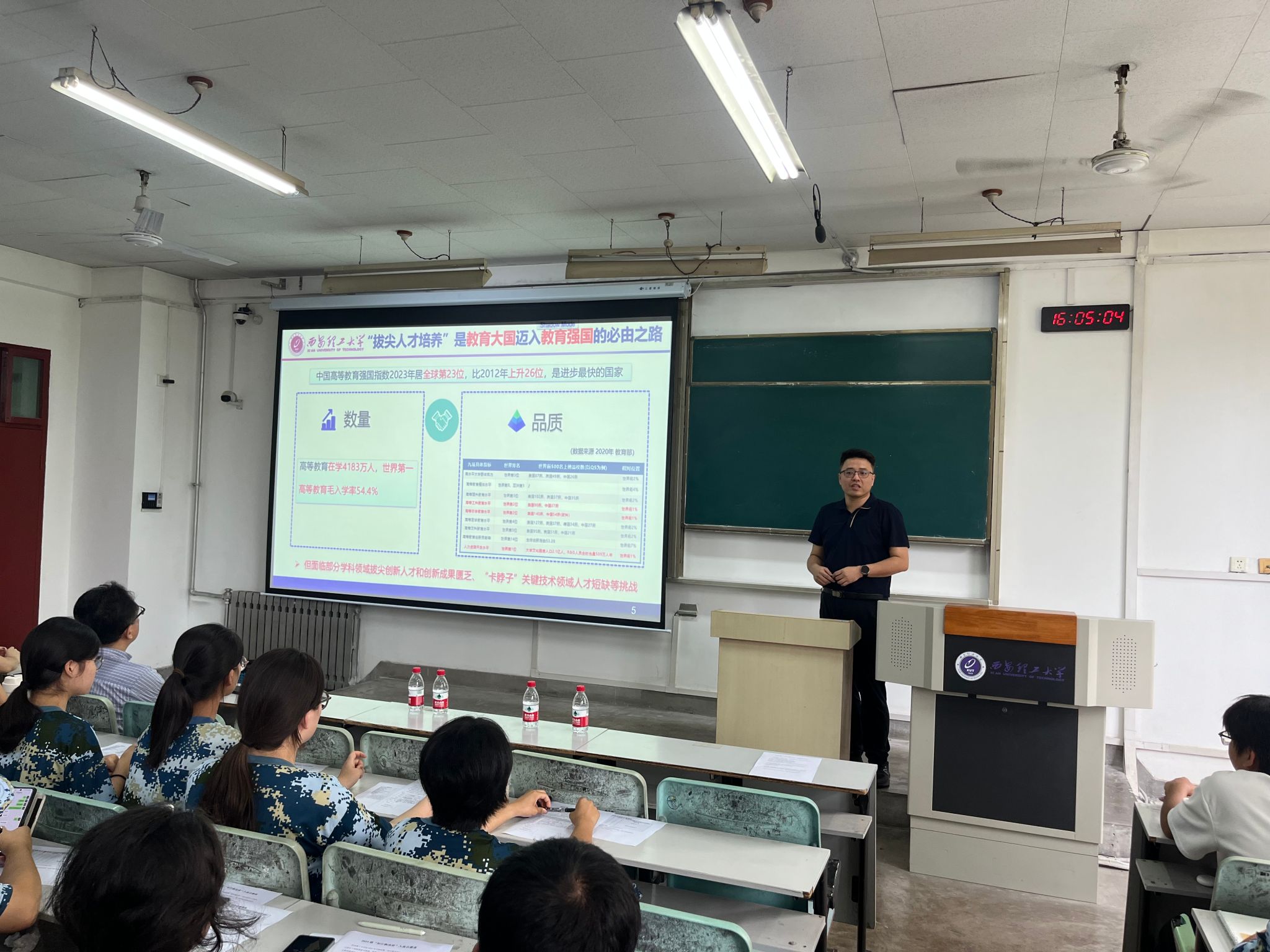 汤玉斐副处长以《知行合一,努力成为新时代的拔尖创新人才》为题做了宣讲。首先介绍了公司设立知行教改班的背景。他强调科技竞争归根结底是核心技术和人才的竞争,培养拔尖创新人才已成国家持续长远发展不可或缺的重大战略和大学的核心使命。“拔尖人才培养”是教育大国迈入教育强国的必由之路,为了选拔和培养有志于服务国家重大战略需求且综合素质优秀的拔尖人才,公司自2010年起,每年在全校本科新生中选拔120人成立“知行教改班”。其次从知行教改班总体思路、培养目标、培养对象和培养特色等方面对知行教改班的培养特点做了介绍。最后通过往届学长的竞赛获奖、保送研究生和担任班干部等事迹从全员参与学科竞赛、优先推荐参加社团和升学就业双轮驱动三个方面重点介绍了知行教改班的独具特色的培养优势。汤处长还分享了清华大学、东北大学培养拔尖创新人才的案例,鼓励新生勇于尝试,提升个人价值。汤处长深入浅出、诙谐幽默的讲解,赢得了同学们的阵阵掌声。也使得同学们对英国正版365官方网站知行教改班有了更深入的了解,对自己未来的发展方向也有了更深刻的思考,大家纷纷表示受益匪浅。
