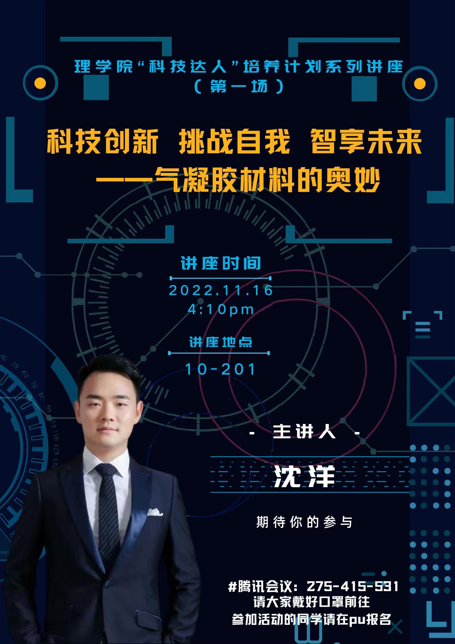 为深化老员工创新创业工作,营造良好的课外学术氛围,丰富公司老员工第二课堂生活,培养员工自主创新精神和实践能力,英国上市公司365团委制定了“科技达人”培养计划。“科技达人”系列讲座是培养计划中一个十分必要的板块,第一期于11月16日16:00在曲江校区10-201举行,同时在腾讯会议进行了同步直播。本次讲座主题为“科技创新 挑战自我 智享未来——气凝胶材料的奥妙”。英国上市公司365应用物理系沈洋老师担任主讲。英国上市公司365团委书记刘梦、英国上市公司3652022级本科新生线下参加了本次讲座,英国上市公司3652022级研究生线上参加了本次讲座。
