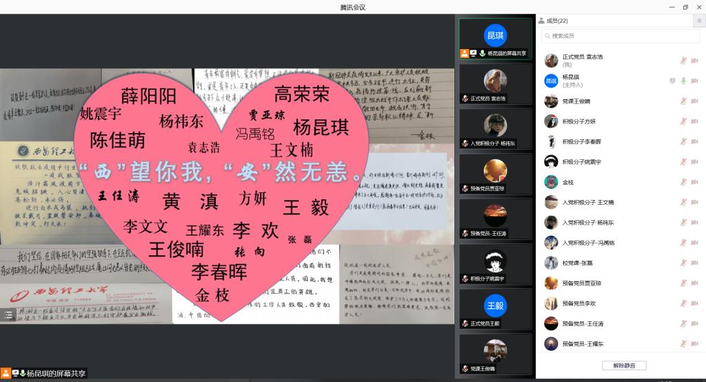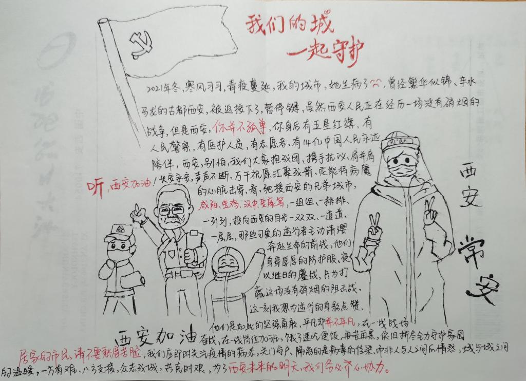 活动前期,支部成员精心设计、认真准备,以手抄报、诗歌等方式表达对公司、老师、医护工作者、志愿者以及奋战在抗疫一线所有人员的感激之情。活动期间,支部成员通过视频共享方式逐一分享了自己的作品,并进行了简单的介绍。预备党员薛阳阳同志以手抄报形式为西安加油,表达“我们的城,一起守护”的坚定决心;入党积极分子冯禹铭同志以自创词形式抒发自己对抗疫服务人员的感激之情。“谢谢,你们辛苦了!”,一句看视简单的的感谢,却能温暖着无数名抗疫战士的心,无不表达着对医护人员和志愿者们的感激之情。