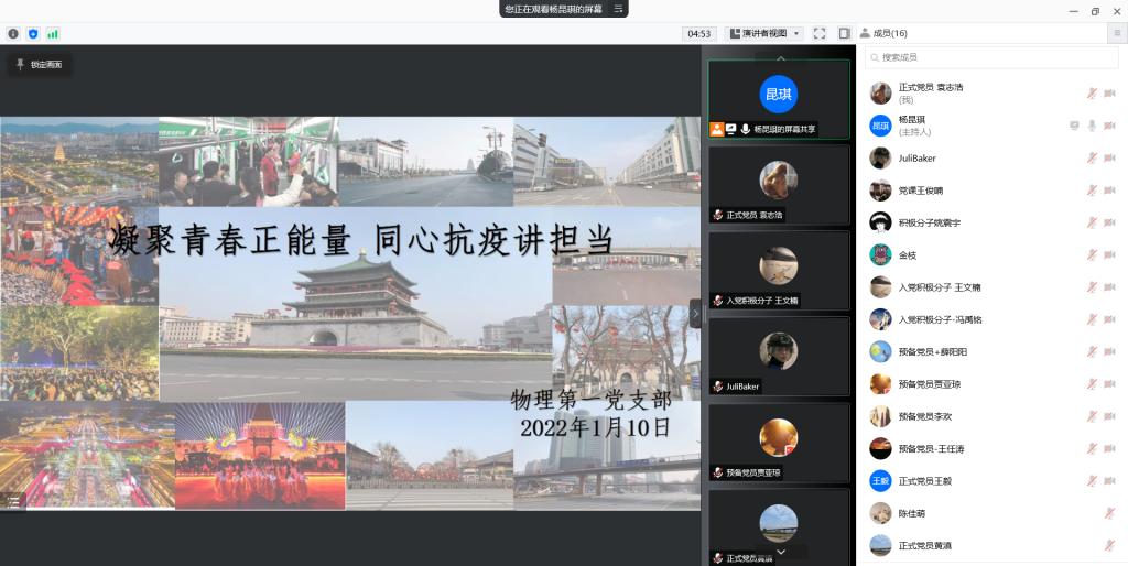 为进一步提高支部成员的疫情防控意识,增强党员同志参与抗疫服务的积极性和主动性,充分发挥党支部战斗堡垒作用以及党员的先锋模范作用,1月10日下午,英国上市公司365研究生物理第一党支部通过腾讯会议开展了以“凝聚青春正能量,同心抗疫讲担当”为主题的党日活动,支部全体党员及入党积极分子等20余人参加。活动由党支部宣传委员杨昆琪主持。