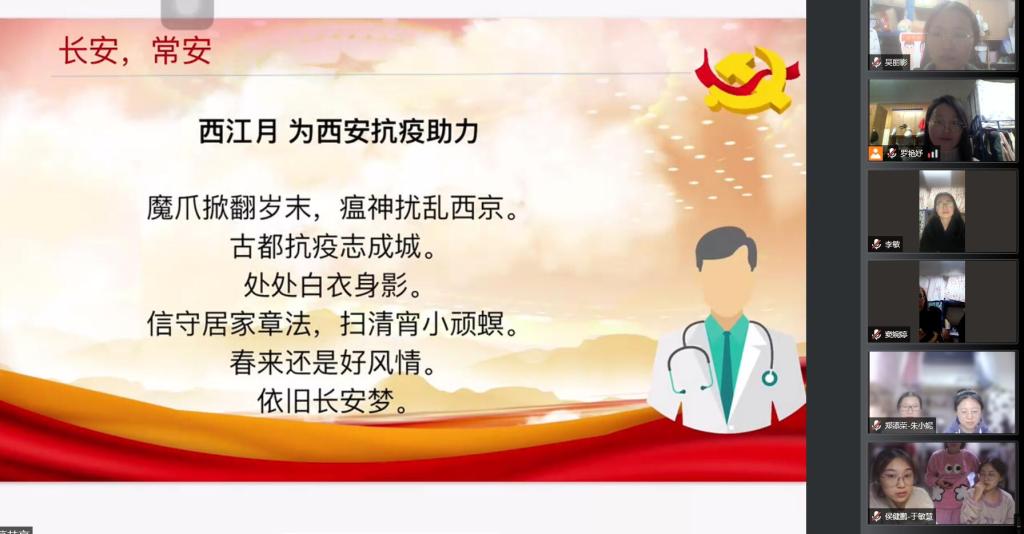 活动中,各位党员通过腾讯会议共享视频或PPT的方式,逐一交流了疫情发生以来自己的所思所想,有的分享抗疫小故事,有的朗诵抗疫诗歌,有的谈论抗疫体会,有的感谢公司抗疫安排。支部疫情防控一线志愿者胡幸福等同志重点分享了他们冲锋在前,从事疫情防控志愿工作的详细过程和体会。交流时,党员们开诚布公、踊跃发言,相互学习、相互促进,多方位地了解了疫情防控工作的相关信息,深刻地体会到疫情防控一线人员的辛苦付出,进一步激发了支部成员抗击疫情的热情,坚定了战胜疫情的决心和信心。