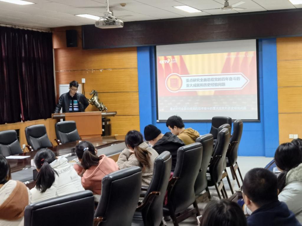 活动伊始,支部书记胡扬帆介绍了十九届六中全会的背景及基本情况。紧接着全体成员集中观看了《中国共产党第十九届中央委员会第六次全体会议公报》视频。