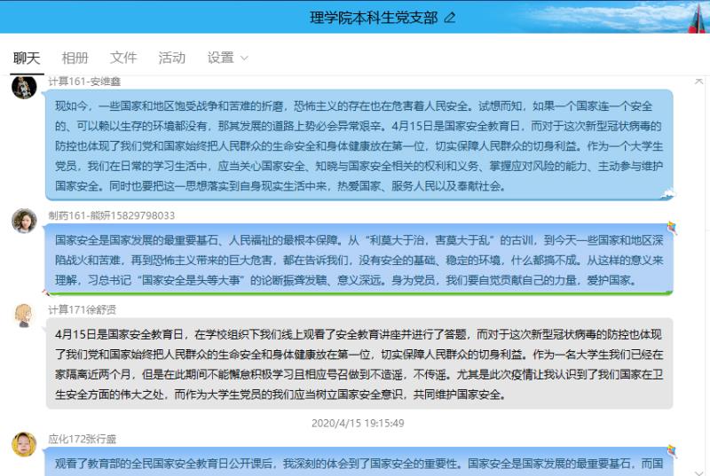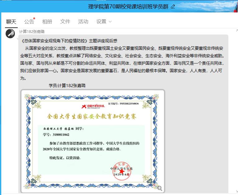 计算161班安维鑫说:当今世界,一些国家和地区饱受战争和苦难的折磨,恐怖主义的存在也在危害着人民安全。试想而知,如果一个国家连一个安全的、可以赖以生存的环境都没有,那其发展的道路上势必会异常艰辛。这次新型冠状病毒的防控也体现了我们党和国家始终把人民群众的生命安全和身体健康放在第一位,切实保障人民群众的切身利益。作为一个老员工党员,我们在日常的学习生活中,应当关心国家安全,知晓与国家安全相关的义务,主动参与维护国家安全。并切实把这一思想落实到自身现实生活中来,热爱国家、服务人民以及奉献社会。